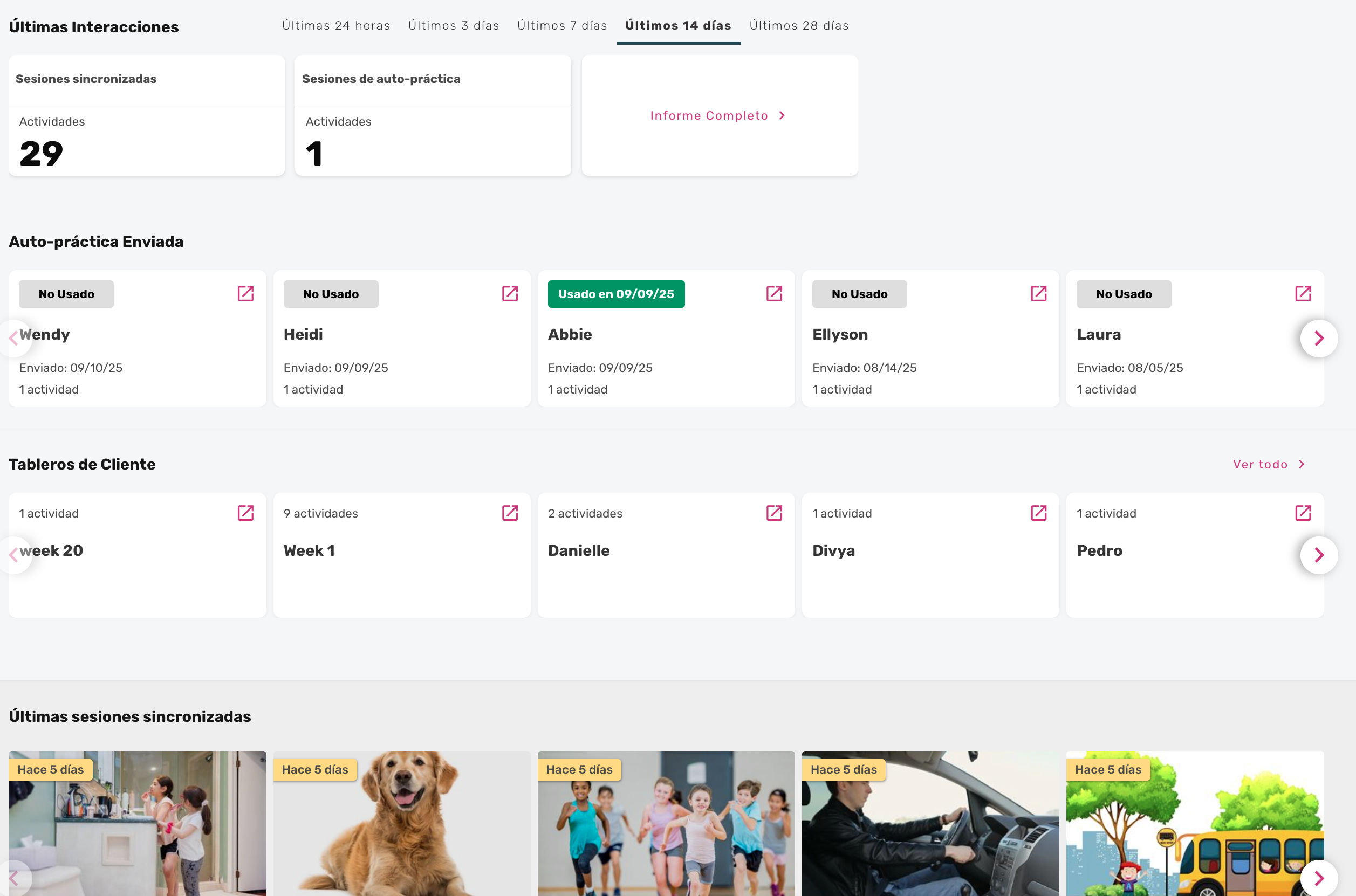 Incluyendo informes de uso, resúmenes de sesiones sincrónicas, datos de auto-práctica y detalles de las actividades asignadas y su uso.